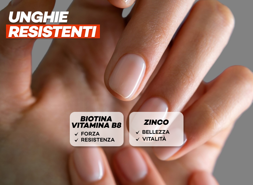 Arricchito con un complesso di vitamine, piante e minerali: Vitamina C, Equiseto dei campi, Biotina B8 e Zinco dedicato al sostegno di pelle, unghie e capelli.